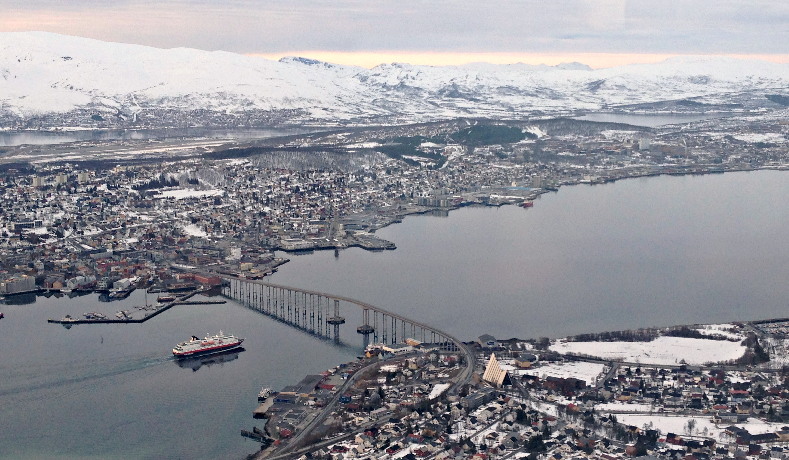 The Hurtigruten ship leaving Tromsø in the evening, to continue its journey. This photo was taken as we were waiting for the sunset on the Fjellheiser Storsteinen mountain viewpoint above the city.